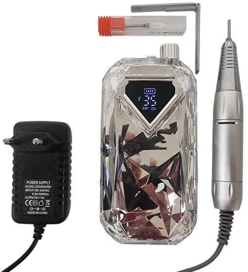 Diamond Crystal Akkumulátoros Műkörmös Csiszológép: Tökéletes manikűr bárhol, bármikor! ? Ez a nagy sebességű, vezeték nélküli műkörmös csiszológép a szalonod vagy otthonod ékköve lehet. A kristály gyémánt design eleganciát kölcsönöz, míg a hordozható kivitel szabadságot biztosít a munkában. Főbb jellemzők: ✨ Gyönyörű design: Választható kristály gyémánt színben. ? Nagy sebesség: Maximális 35000 fordulat/perc a gyors és hatékony munkához. ? Akkumulátoros működés: 8-10 óra üzemidő egyetlen feltöltéssel (3 óra töltési idő). ? Hordozható kivitel: Könnyű és kompakt, így bárhová magaddal viheted. ⚙️ Fokozatmentes sebességszabályozás: Az LCD képernyőn nyomon követhető. ? Forgásirány váltás: Gyors és egyszerű váltás a kényelmes használat érdekében. ?️ Kényelmes kézi egység: Golyóscsapágyazott, tartós, könnyű és csendes. Használat: Műköröm készítés Manikűr Száraz pedikűr Élvezd a professzionális minőségű manikűrt és pedikűrt bárhol és bármikor ezzel a stílusos és praktikus csiszológéppel! ?