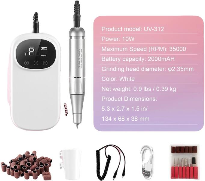 VEVOR Akkus Szögfúró/Körömcsiszoló - Professzionális körömápolás otthon ? A VEVOR akkus szögfúró/körömcsiszoló ideális eszköz a professzionális minőségű manikűr és pedikűr elkészítéséhez otthon. Nagy teljesítményű motorjának és sokoldalú tartozékainak köszönhetően könnyedén formázhatod, csiszolhatod és polírozhatod körmeidet. Főbb jellemzők: ? Nagy sebesség: Akár 35 000 fordulat/perc sebesség a gyors és hatékony körömápolásért. ? Hosszú akkumulátor-élettartam: Akár 6 órás vezeték nélküli használat egyetlen töltéssel. ? Hordozható kialakítás: Könnyű és kompakt, így bárhová magaddal viheted. ? LCD kijelző: Valós idejű sebesség- és akkumulátor-szint kijelzés a könnyű használatért. ? Teljes körű készlet: 6 különböző csiszolófej és 50 csiszológyűrű a sokoldalú felhasználásért. Műszaki adatok:Jellemző ÉrtékAnyag AlumíniumAkkumulátor 2000 mAhTeljesítmény 10WMax. sebesség 35 000 ford. /percTömeg 0,39 kgKijelző LCDTartozékok 6 csiszolófej, 50 csiszológyűrűÉlvezd a professzionális körömápolás élményét a VEVOR akkus szögfúróval/körömcsiszolóval! ✨